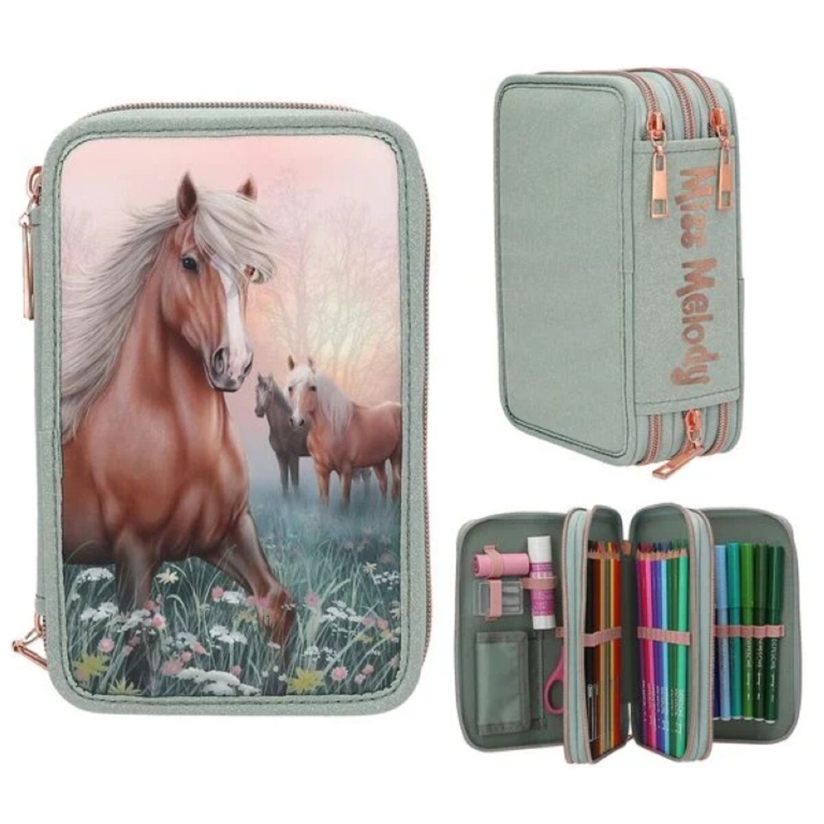 Die glitzerig salbeigrüne 3-Fach-Federtasche von Miss Melody wirkt mit dem Pferde-Motiv auf einer Wiese im dunstigen Morgenlicht wunderschön harmonisch und traumhaft ruhig. Mit roségoldenen Reißverschlüssen und Logoaufdruck. Die drei separaten Fächer sind komplett gefüllt mit je 18 Bunt- und Filzstiften, 2 Bleistiften, Anspitzer, Radierer, Lineal, Schere, Klebestift und einem kleinen Klett-Täschchen. Material: 100 Prozent Polyester