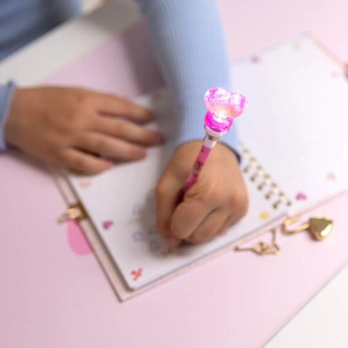 Beim Schreiben geht ein Licht auf: Die TOPModel-Kugelschreiber haben transparente Herz-Topper mit Lichtfunktion. Diese leuchten durch das Aufdrücken der Minen-Spitze (blaue Tinte) auf.