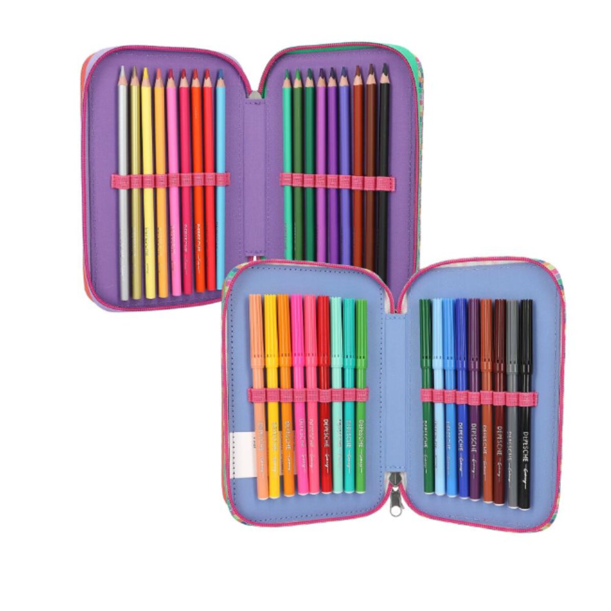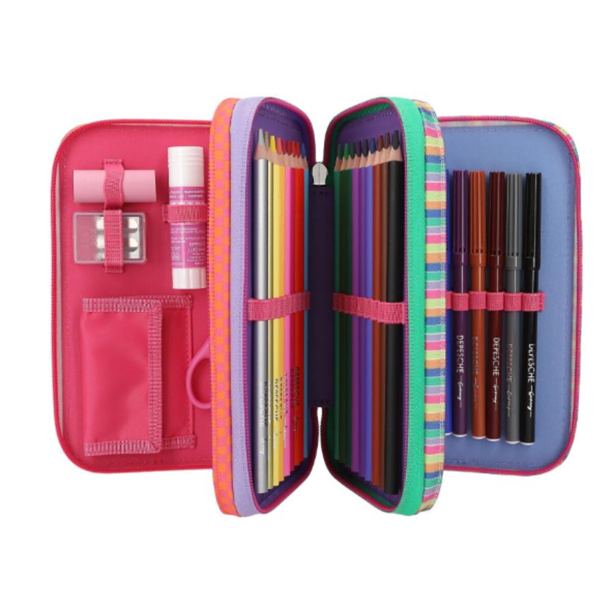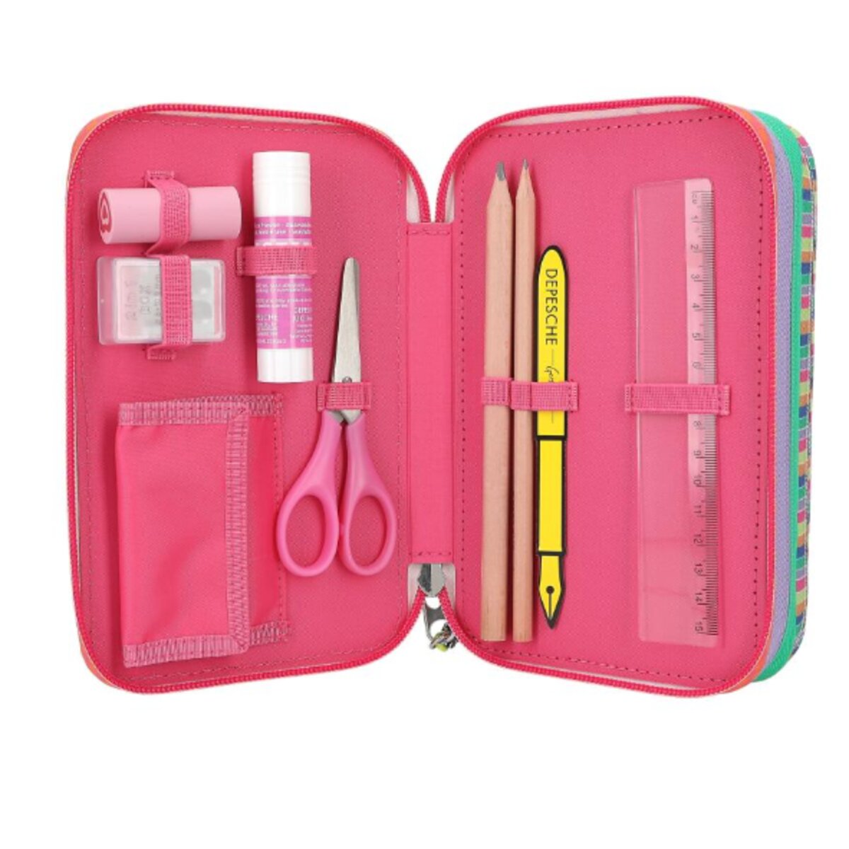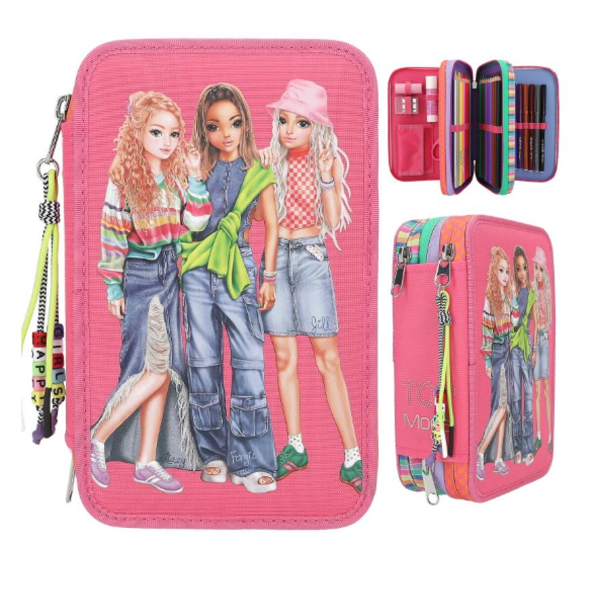 Farbenfroh macht happy: Die pinke TOPModel-Federtasche JOY hat auf der Front ein großes Motiv mit drei Models, verschieden gemusterte Reißverschlussbänder und einen supercoolen Reißverschluss-Anfasser aus hippen Bändern und Buchstabenperlen (HAPPY GIRLS). Die drei separaten Fächer sind komplett gefüllt mit je 18 Bunt- und Filzstiften, 2 Bleistiften, Anspitzer, Radierer, Lineal, Schere, Klebestift und einem kleinen Täschchen. Material: 100 Prozent PES