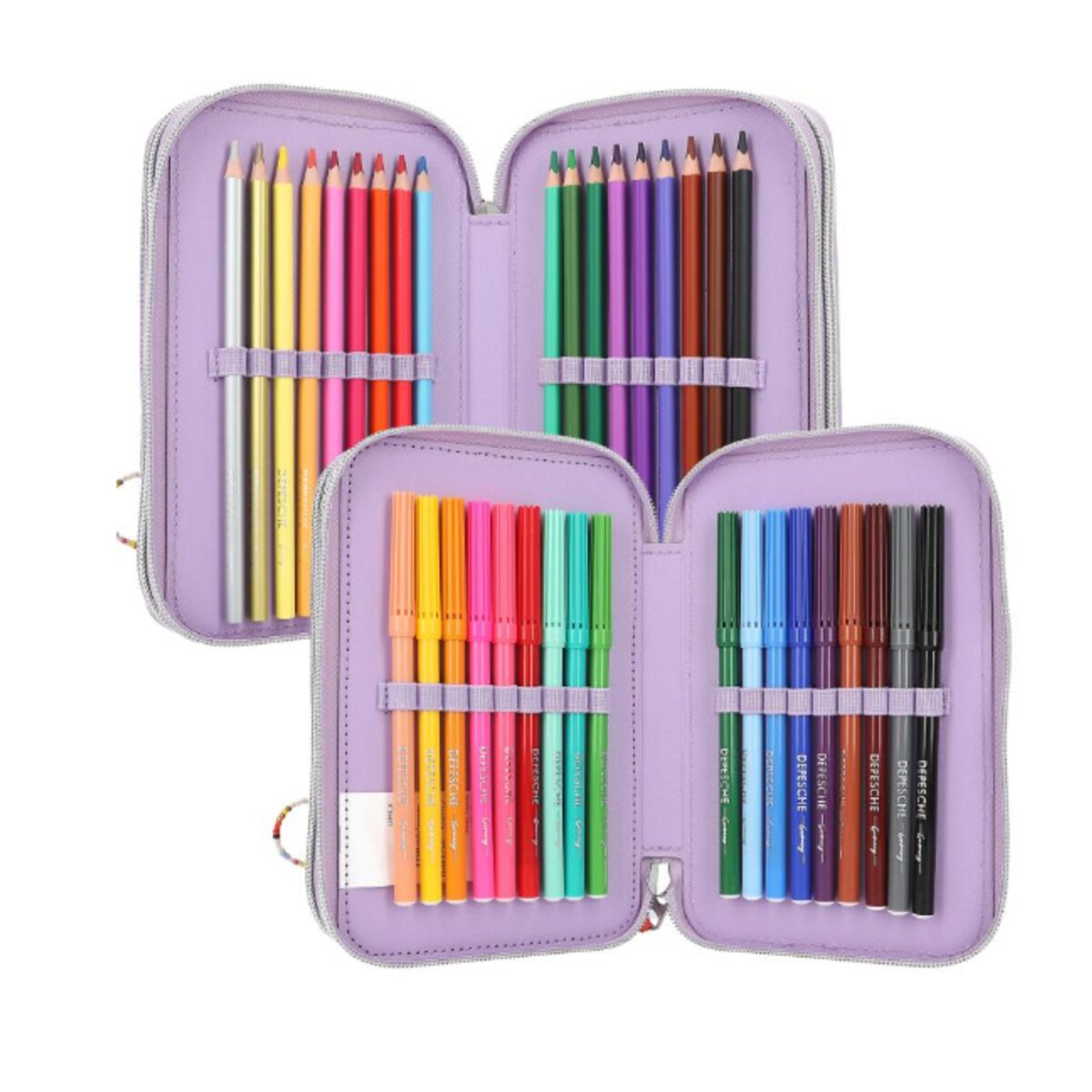 applizierten Tasche in der ein kleines Handy steckt, befestigt an einer Handykette aus bunten Perlen. Durch einen Magneten kann man das Handy dem Model zum Telefonieren in die Hand legen. Die drei separaten Fächer der Federtasche sind komplett gefüllt mit je 18 Bunt- und Filzstiften, 2 Bleistiften, Anspitzer, Radierer, Lineal, Schere, Klebestift und einem kleinen Klett-Täschchen. Material: 100 Prozent PES