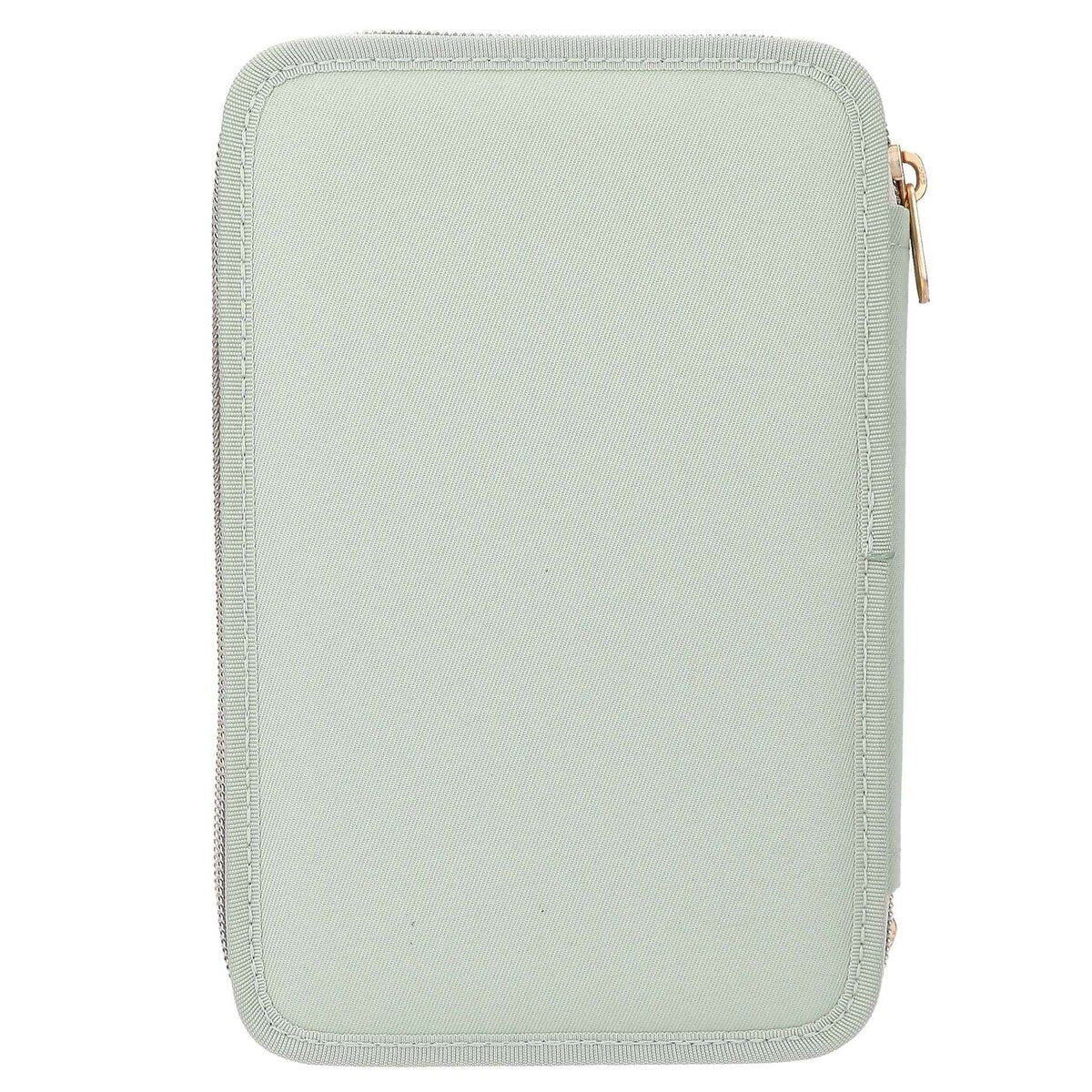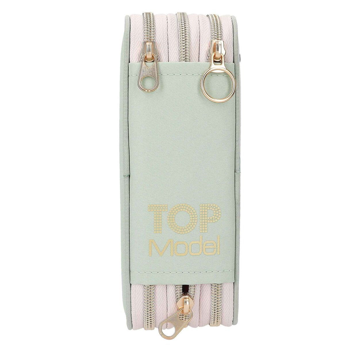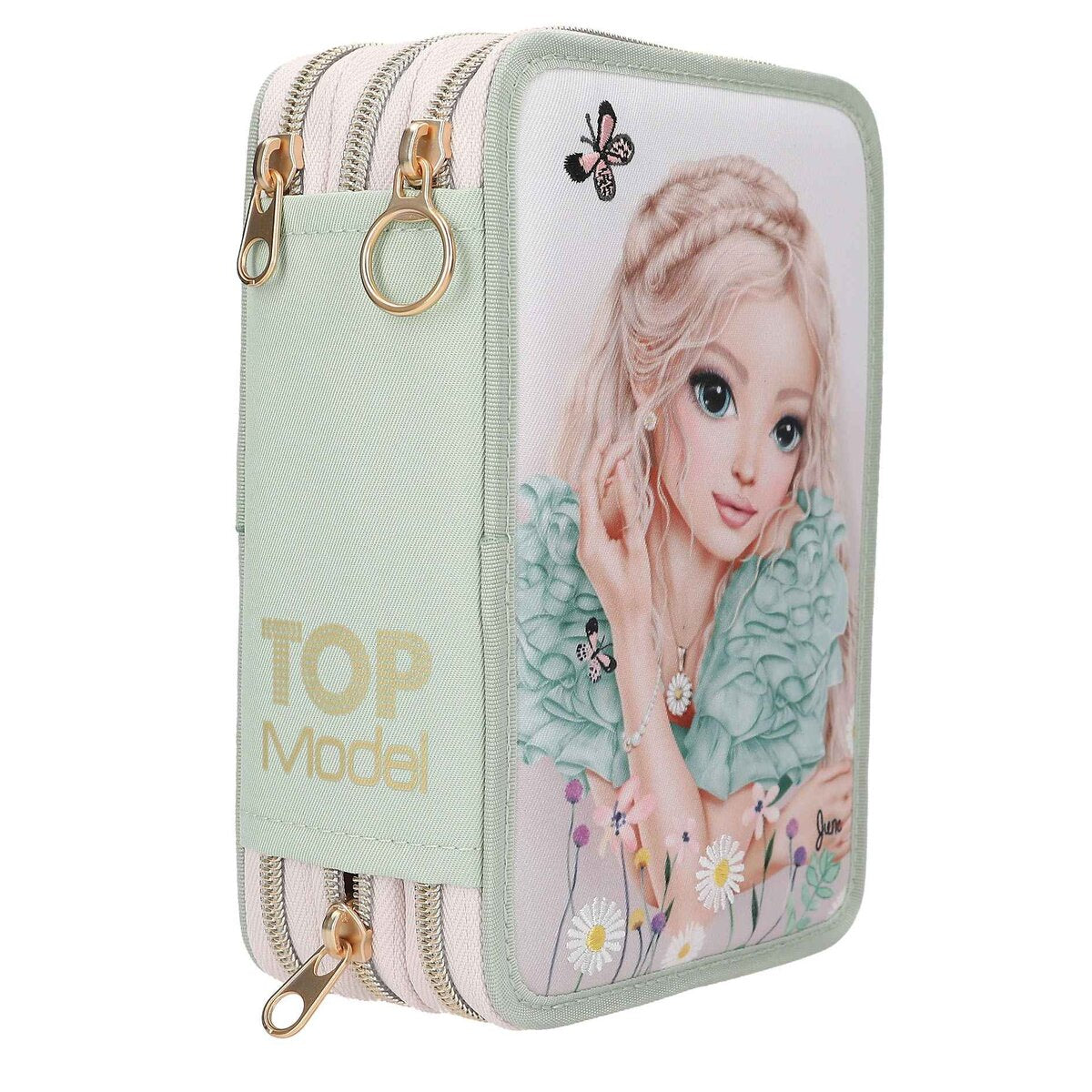 Die salbeigrüne 3-Fach-Federtasche von TOPModel hat auf der Front ein großes romantisches Model-Motiv mit zarten Blumen und Schmetterlingen von denen einige gestickt sind. Die drei separaten Fächer sind komplett gefüllt mit je 18 Bunt- und Filzstiften, 2 Bleistiften, Anspitzer, Radierer, Lineal, Schere, Klebestift und einem kleinen Klett-Täschchen. Material: 100 Prozent Polyester