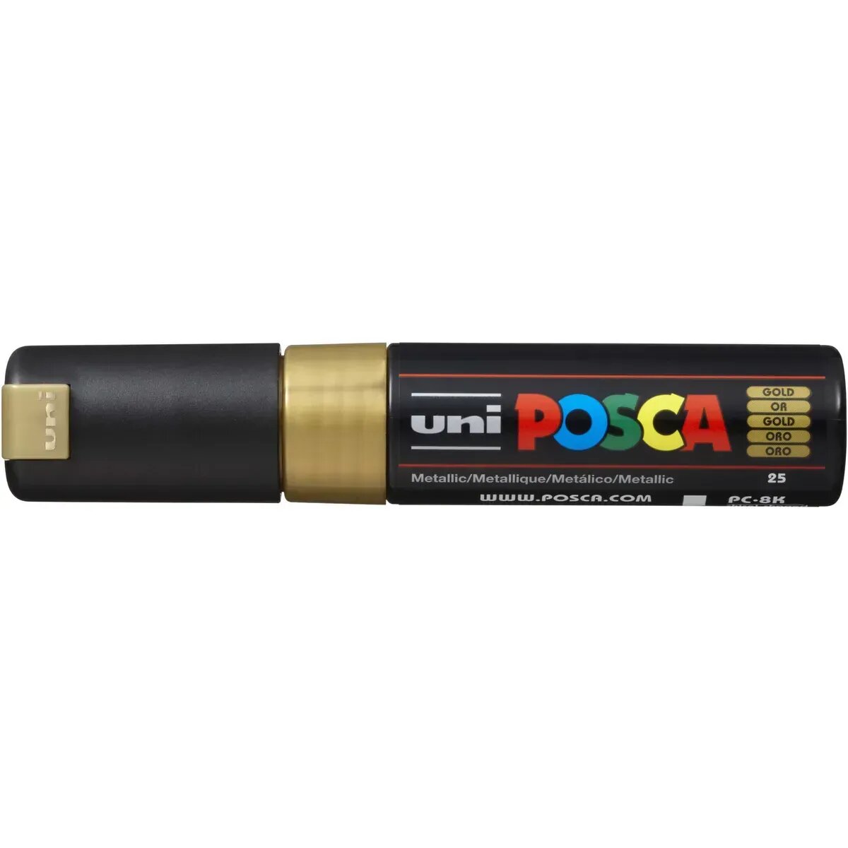 Der Posca Pigmentmarker auf Wasserbasis überzeugt durch seine deckenden und lebendigen Farben. Er schreibt auf fast allen Materialen wie z.B. Metall, Kunststoff, Papier, Karton oder Stoff und ist dabei permanent. Auf Glas ist er wischfest, lässt sich jedoch mit Wasser entfernen. Die Stifte sind weit verbreitet unter den Künstlern und Hobbykünstlern, aber auch in der Industrie. Auch Kinder lieben das Malen mit den Markern und ganz nebenbei wird die Kreativität der kleinen Künstler gefördert. Ein perfekter Marker für die Erstellung einzigartiger Designs auf vielen Oberflächen oder auch in der Automobilindustrie. Sind die Farben noch feucht so können sie aquarelliert oder auch gemischt werden, nach dem Trocknen sind sie übermalbar. Der Marker mit breiter Keilspitze (PC8K) erzeugt eine Strichbreite von 8 mm. Die Spitze in Keilform malt je nach gewählter Spitzenseite mit unterschiedlicher Strichbreite. Der Marker eignet sich optimal zum Kolorieren mittelgroßer Flächen. Die Spitze ist abnehmbar und kann so ausgespült oder ausgetauscht werden. Sie erhalten einen Posca Marker in der Farbe gold.