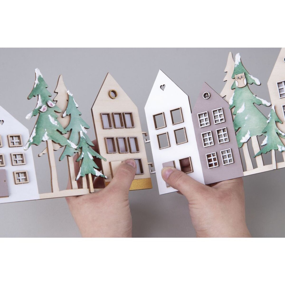 Löse die einzelnen Motivteile aus den beiden Holzplatten, bemale, klebe und dekoriere sie auf den drei Häuserplatten. Nach dem Trocknen steckst du die dekorierten Häuserplatten als kleinen Paravent zusammen. Zu einem strahlenden Lichtelement wird der Aufsteller, wenn du eine LED-Lichterkette oder LED-Teelichter dahinter legst.