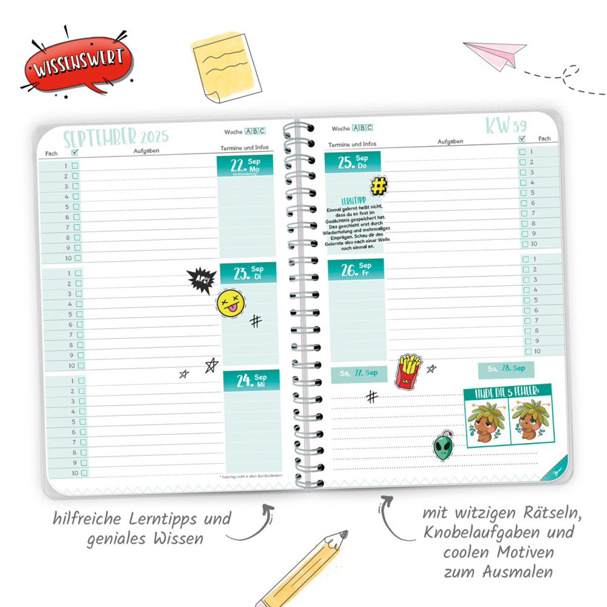 Mit dem bunten WOW-Schulplaner behält man immer den Überblick! Auf einer Doppelseite pro Woche mit Kalendarium gibt es ausreichend Platz zum Eintragen von Fächern, Aufgaben und Terminen. Außerdem hält der Planer hilfreiche Lerntipps, geniales Wissen, Rätsel und Knobelaufgaben bereit. Die originellen Sticker sind perfekt zum individuellen Gestalten, zum Markieren, Sortieren und Dekorieren. Darüber hinaus sind extra Seiten für Stundenpläne, Notenübersicht, Schulferien, Adressen, Geburtstage, Finanzplaner und Jahreskalender vorhanden. Dank der Spiralbindung lassen sich die Seiten leicht umblättern. Mit extra starkem Klarsichtumschlag!